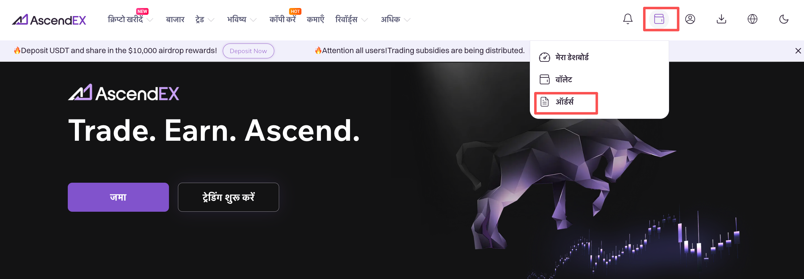 1. AscendEX वेबसाइट पर लॉग इन करें और होमपेज के ऊपर दाएं कोने में ऑर्डर पर क्लिक करें। ड्रॉपडाउन मेनू में "कैश ऑर्डर" चुनें।