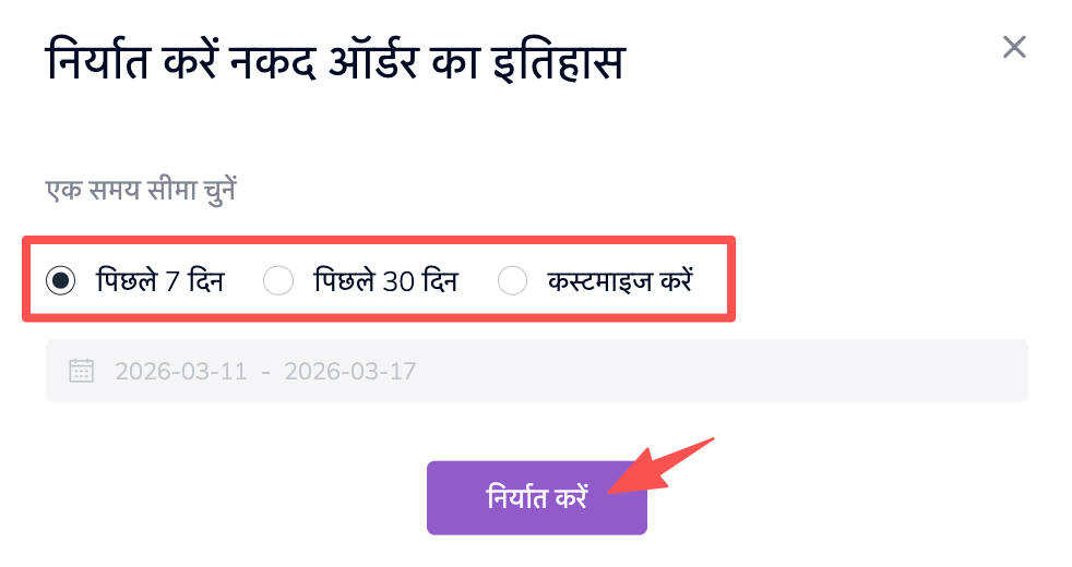 3. पॉप-अप डायलॉग पर एक्सपोर्ट किए जाने वाले ऑर्डर के लिए खास समयावधि चुनें और "एक्सपोर्ट करें" को क्लिक करें।