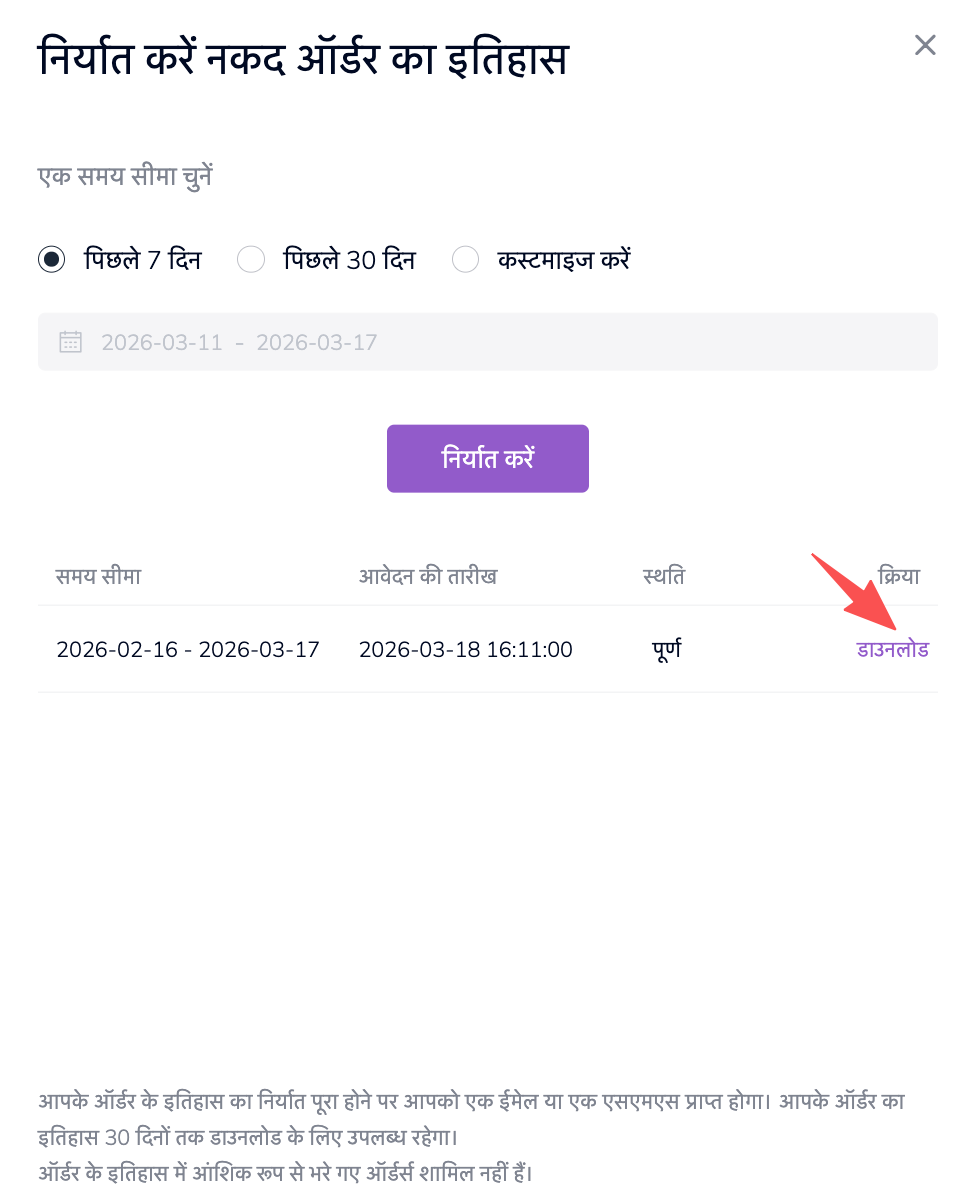 2. एक्सपोर्ट की जाने वाली ऑर्डर हिस्ट्री में आंशिक रूप से भरे गए ऑर्डर शामिल नहीं होंगे।