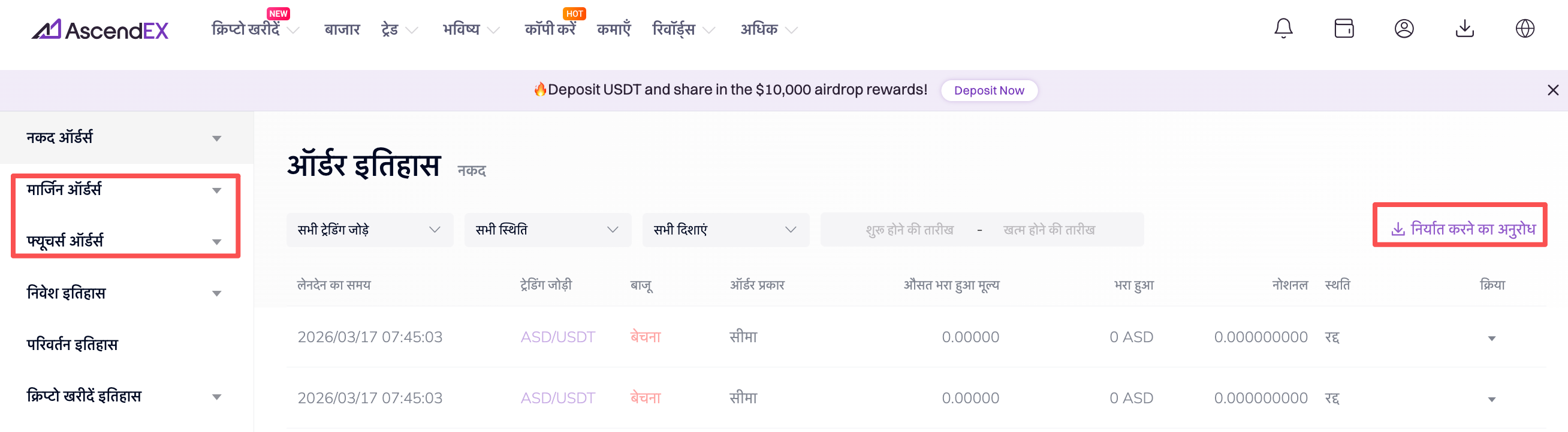 1. AscendEX तीन तरह की ऑर्डर हिस्ट्री एक्सपोर्ट करने की सुविधा देता है: कैश ऑर्डर, मार्जिन ऑर्डर और फ़्युचर्स ऑर्डर।
