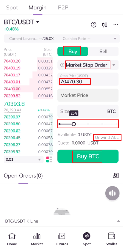 C. Click on [Unwind] and [Buy BTC]. When the stop price is reached, the system will automatically place and fill the order.