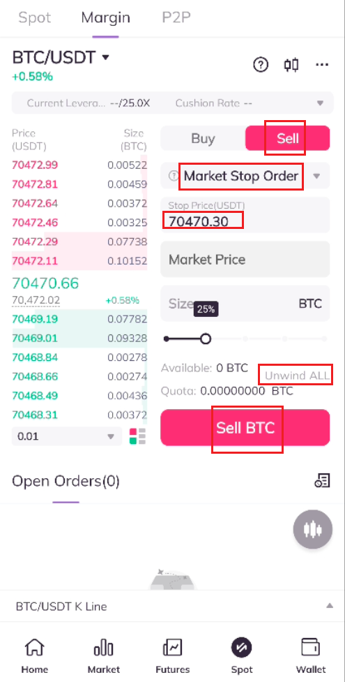 C. Click on [Unwind] and [Sell BTC]. When the stop price is reached, the system will automatically place and fill the order.