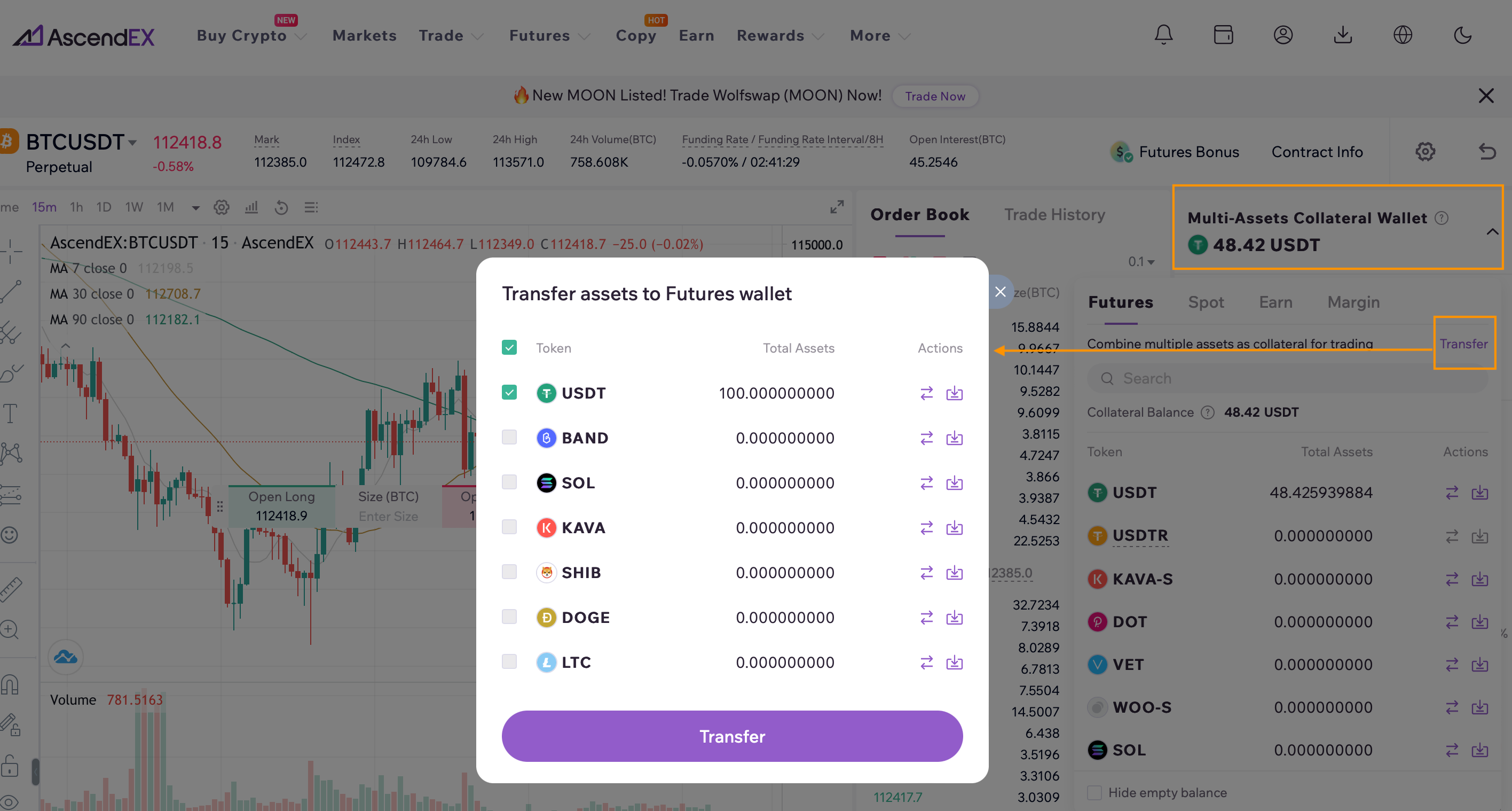 PC: Futures Trading page - Multi-Assets Collateral Wallet - Transfer (Supports batch transfer of assets)