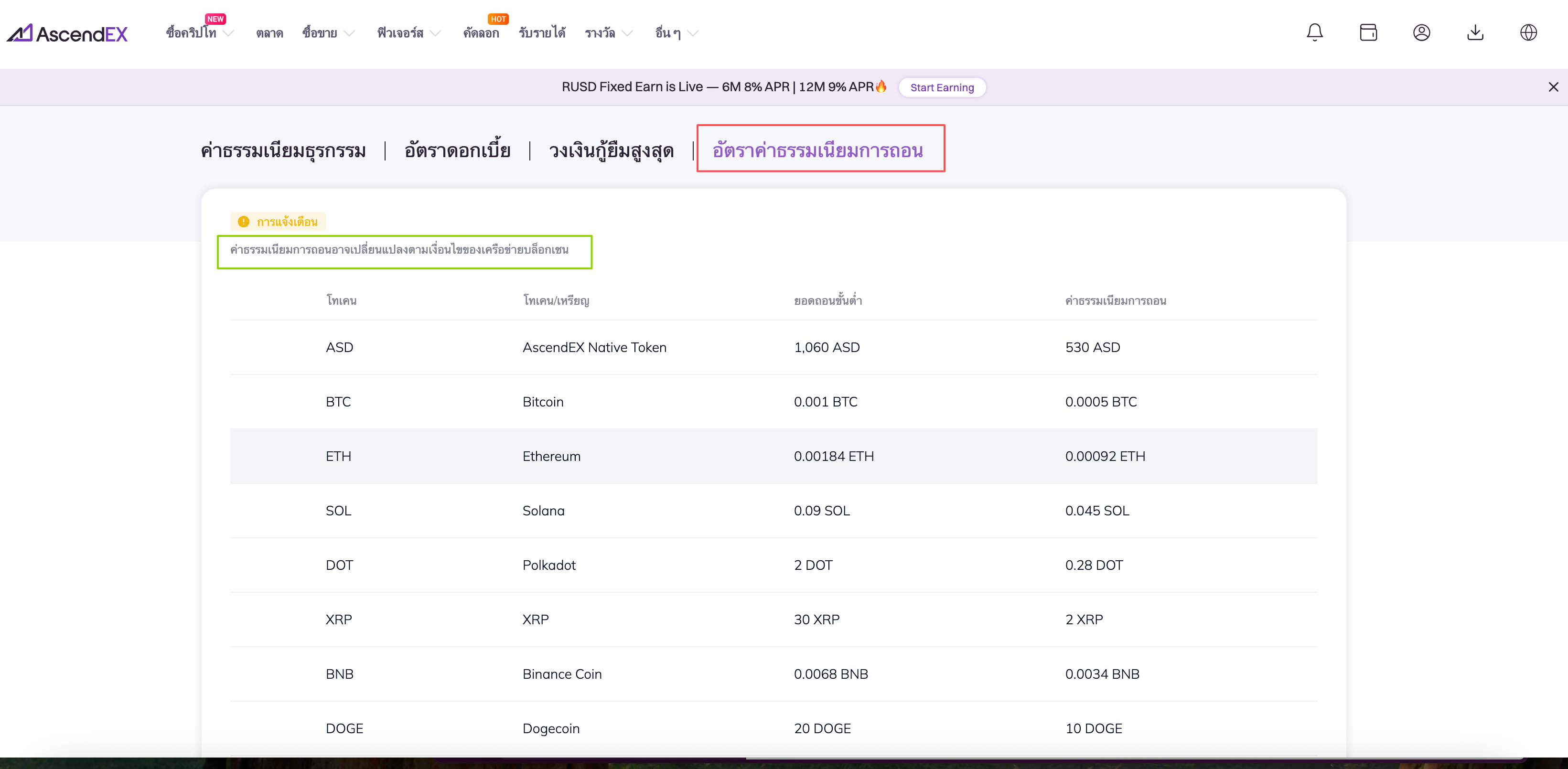 2. ในหน้า อัตราค่าธรรมเนียม คลิก “อัตราค่าธรรมเนียมการถอน” เพื่อตรวจสอบปริมาณการถอนขั้นต่ำและค่าธรรมเนียมการถอนสำหรับโทเคนทั้งหมด