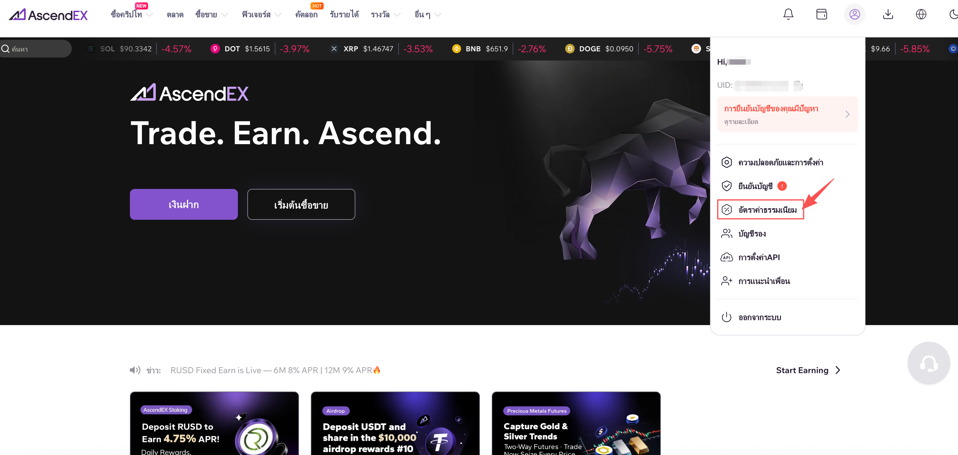 1. เข้าสู่ระบบด้วยบัญชี AscendEX ของคุณบน PC แล้วคลิกไอคอนโปรไฟล์ที่มุมขวาบนของหน้าแรก เลือก "อัตราค่าธรรมเนียม" ในแถบเมนู