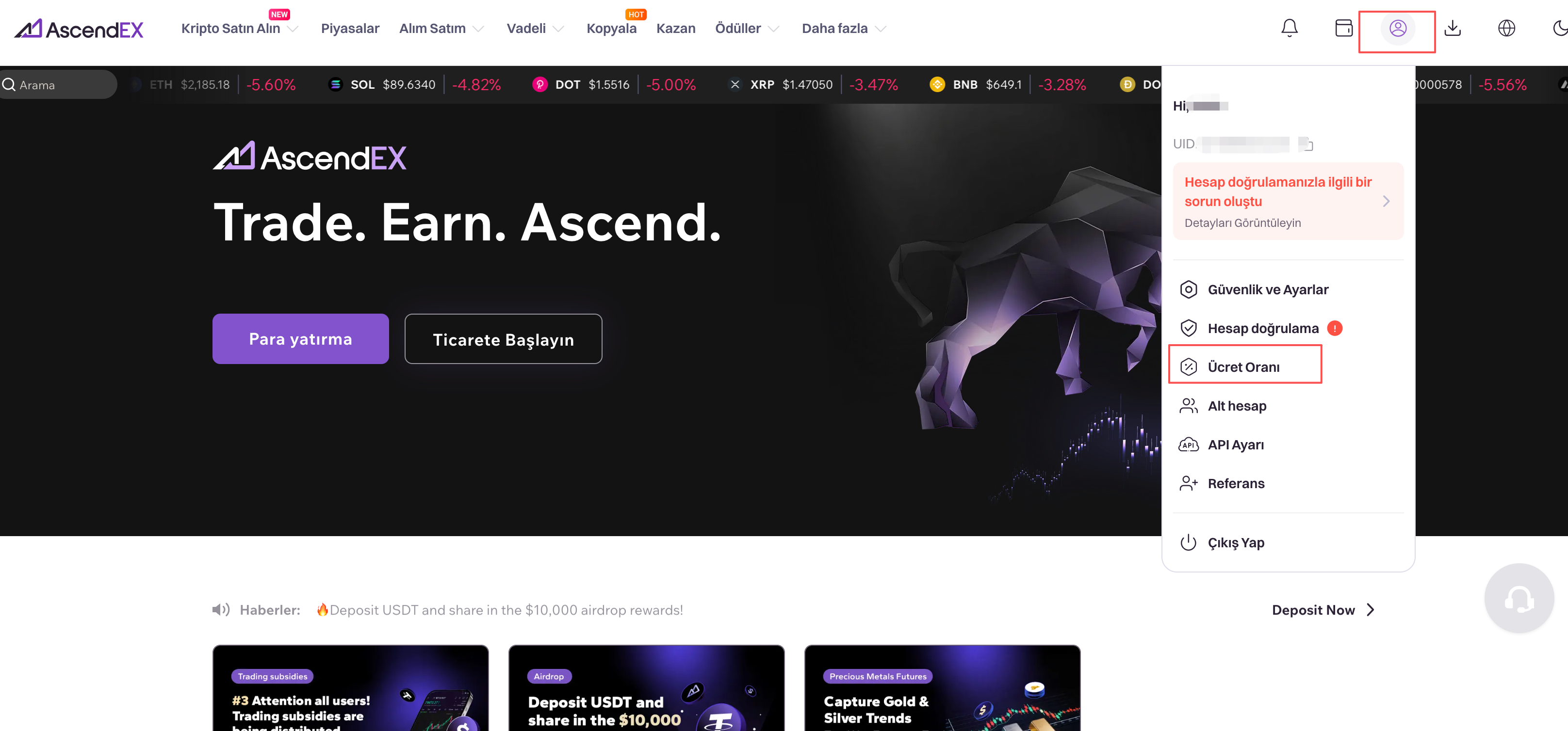 1) AscendEX web sitesini açın ve ana sayfanın sağ üst köşesindeki profil simgesine tıklayın. Açılır menüden "Ücret Oranı"nı seçin
