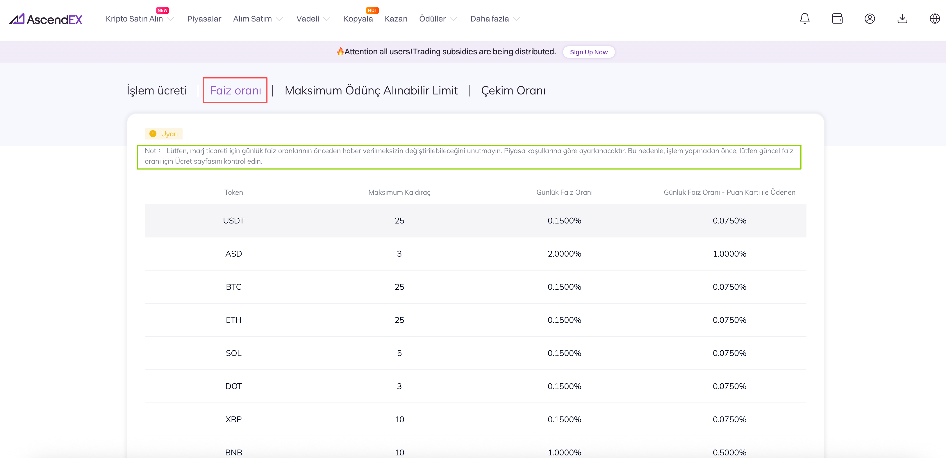 Faiz Oranı, marj ticareti için kullanıldığında bir jetonun günlük borçlanma maliyetini ifade eder. Hangi jetonların kullanıldığına bağlı olarak değişir. AscendEX, geçerli piyasa koşullarına göre marj ticareti için günlük faiz oranını ayarlayacaktır. Marj ticaretinden önce, lütfen Faiz Oranı sayfasını kontrol edin veya mevcut maksimum kaldıracı, günlük faiz oranını ve ayrıca bir Puan Kartı kullanırken ödenen günlük faiz oranını bulmak için aşağıda gösterilen adımları izleyin.