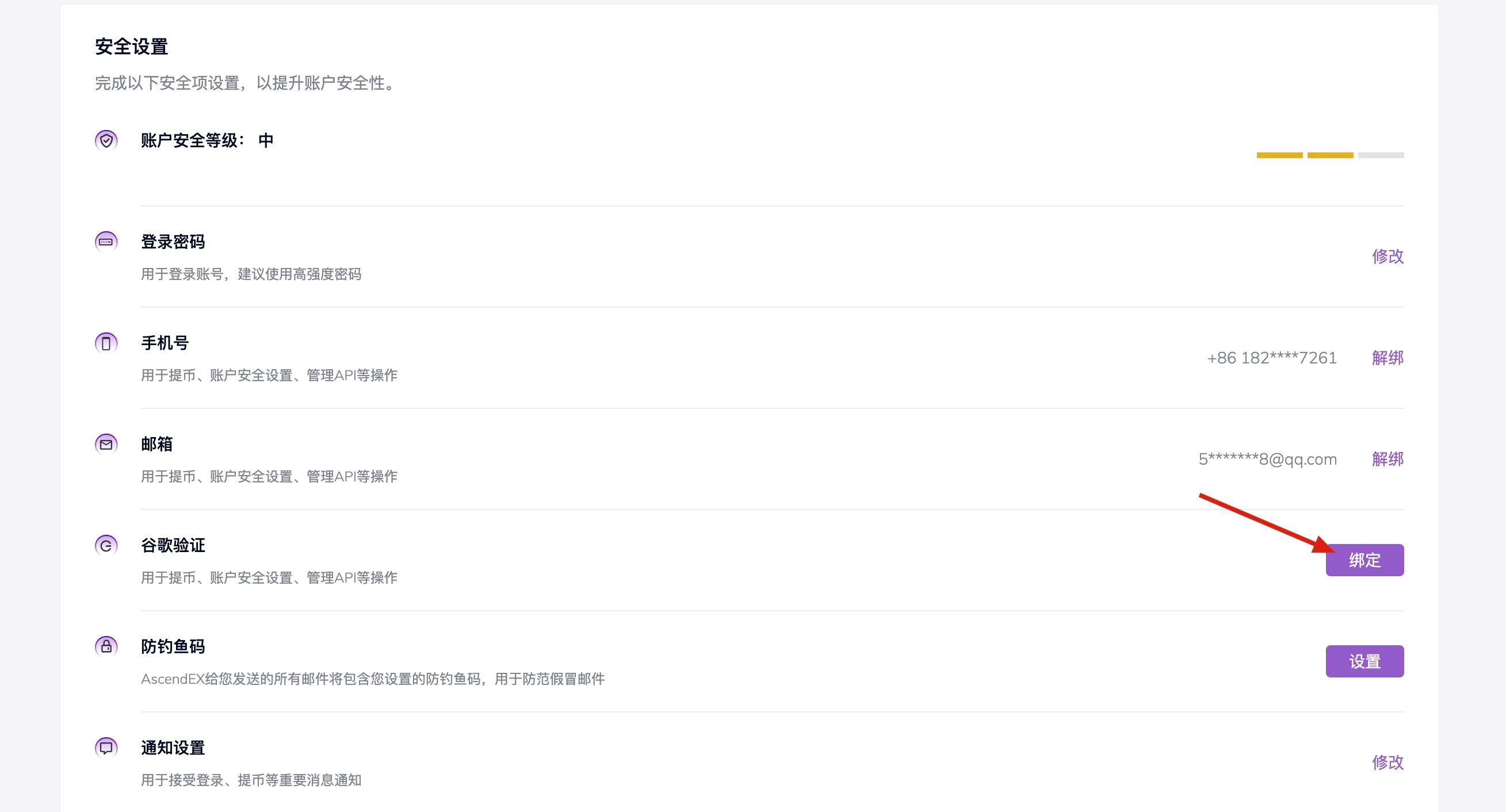 4.重置谷歌验证第二步,关闭谷歌验证器之后,重新进入账户安全与设置页面,点击谷歌验证后方绑定按钮;