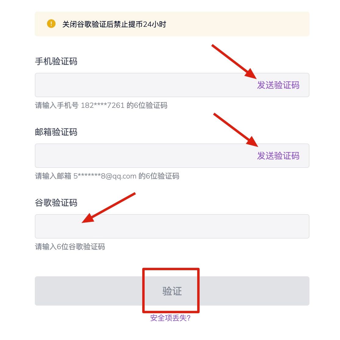 3.点击发送验证码,填写手机短信验证码/邮箱验证码,输入谷歌验证码,点击验证即可关闭谷歌验证器;