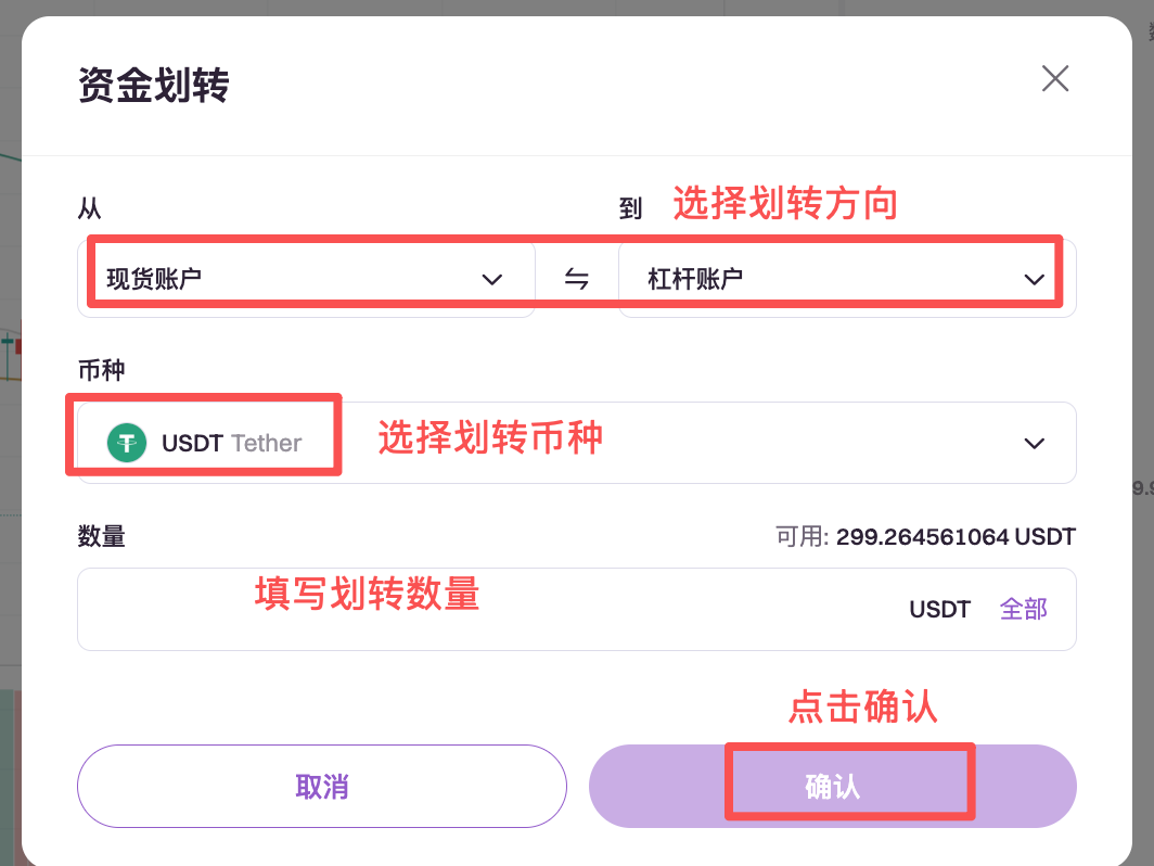 5.选择划转币种,划转方向(可对现货,杠杆,合约进行选择),最后选择划转数量。用户可划转BTC、ETH、USDT等至杠杆账户,杠杆账户所有币种均可作为保证金,点击确认资金划转,即刻划转成功;