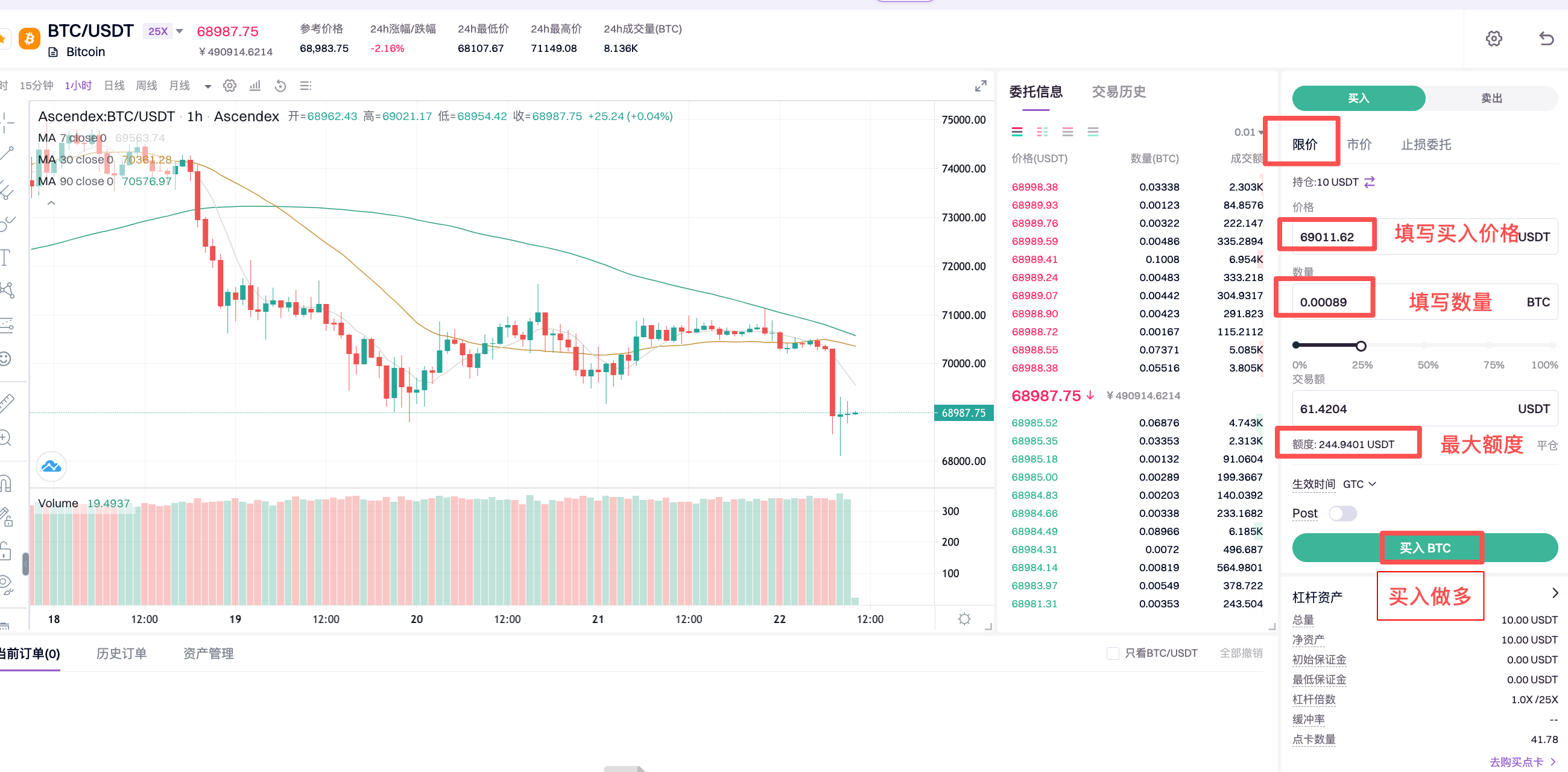 6.资金划转成功,可进行杠杆交易,以BTC/USDT限价做多为例;