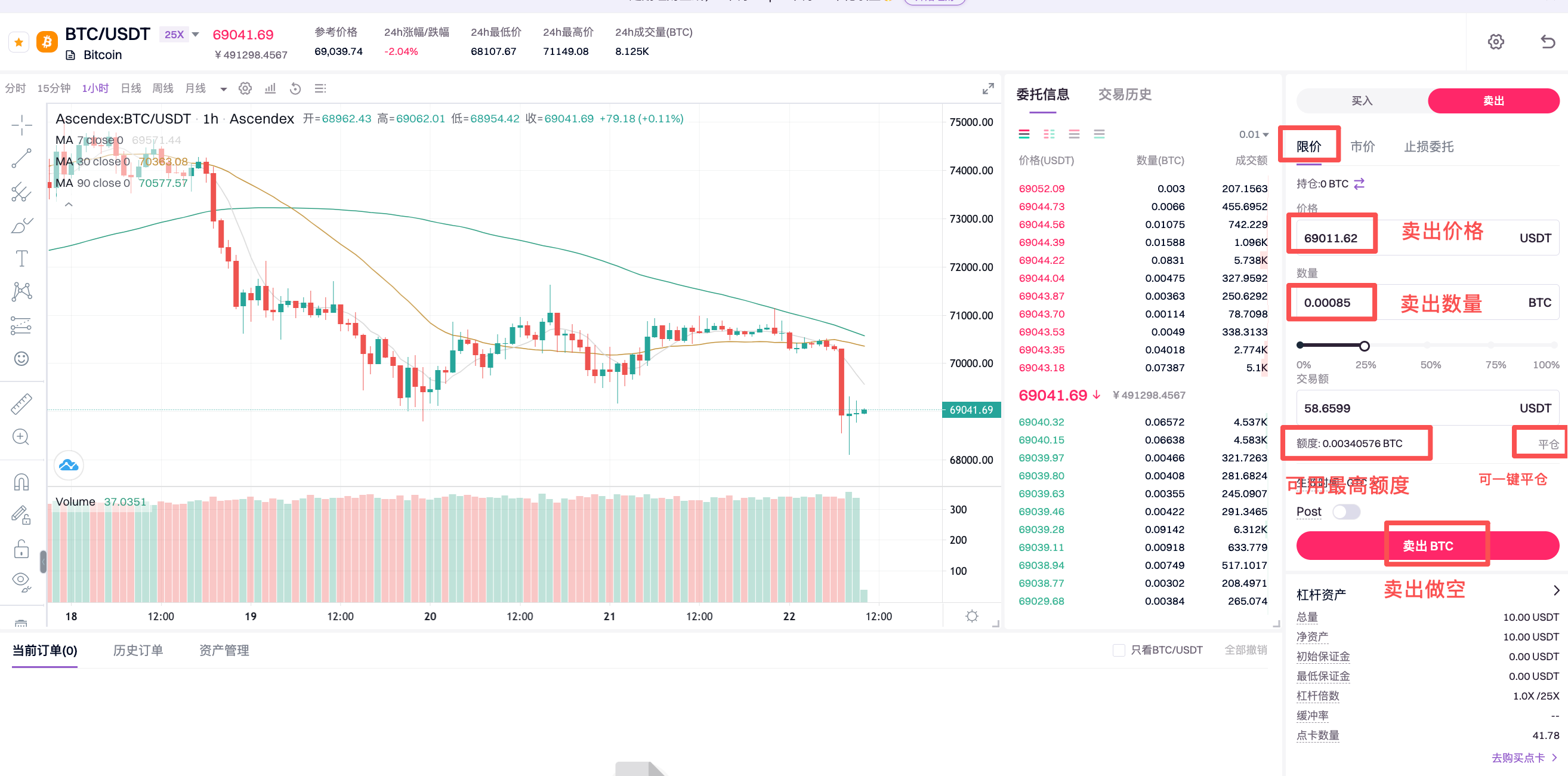 8.假设现在你看跌BTC,可向平台借入BTC卖出BTC做空。输入交易价格,选择交易额度(交易额度就是你最大可用额度的百分比)系统会自动算出你此次的交易额,点击卖出BTC,挂单成交即可。