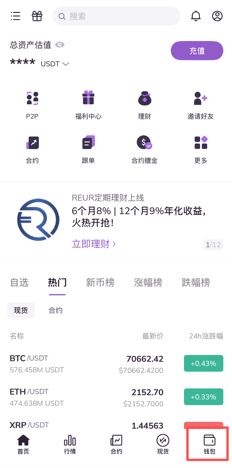 1.打开AscendEX APP,点击首页右下方钱包。