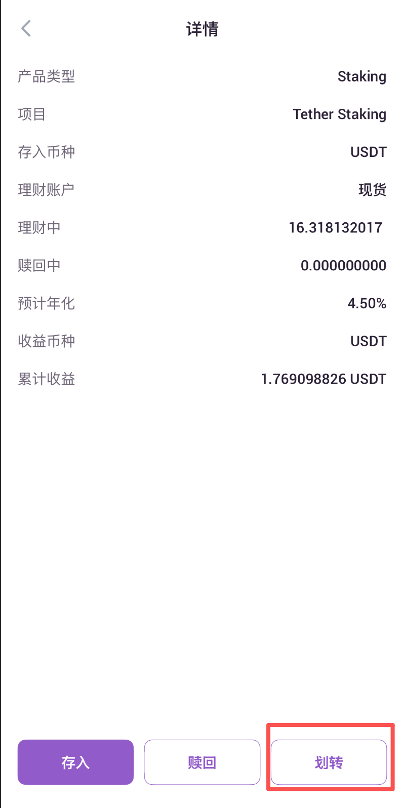 4.进入该项目理财详情页,点击页面最下端划转按钮。