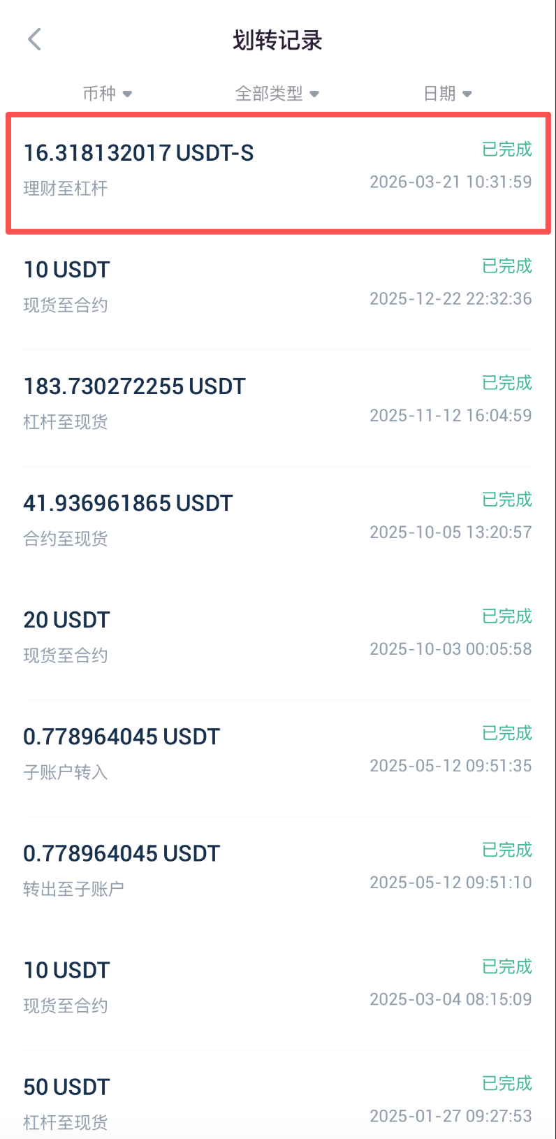 5.进入资金划转页面,划转方向选择从理财划转到杠杆;点击划转币种一栏右侧箭头,选择目标Staking币种(注:Staking资产会以“币种-S”形式显示在您的账户中,如BTC-S);输入币种数量,您也可以参考划转数量栏下方当前币种可用数量,点击右侧全部,实现一键划转当前所有币种。最后点击立即划转按钮,即可完成划转。