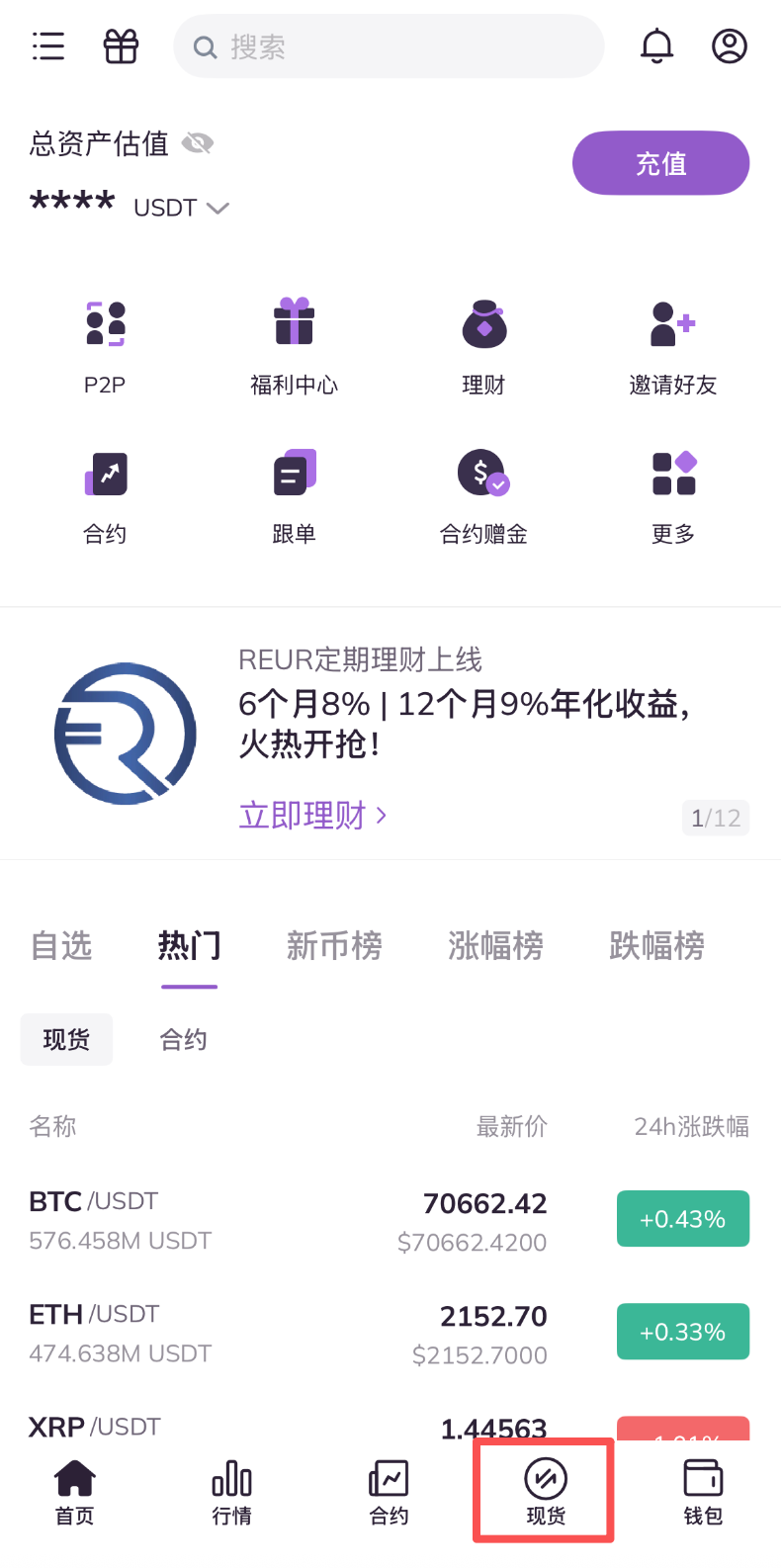 1.打开AscendEX APP,点击首页底部现货。