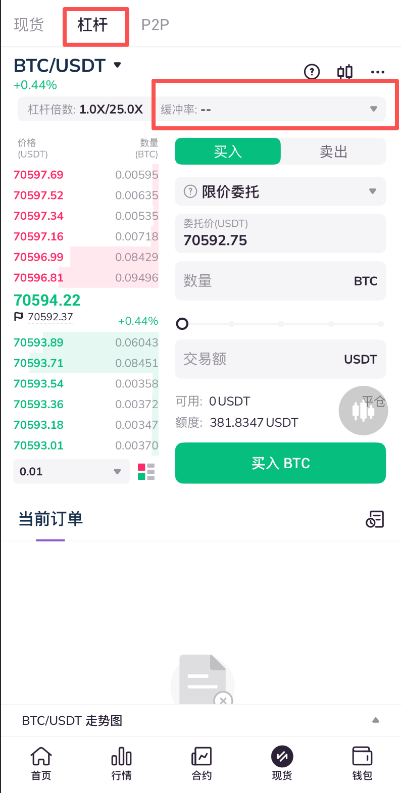 2.进入交易页面,点击页面顶端杠杆。随后点击页面上端缓冲率一栏右侧下拉箭头。