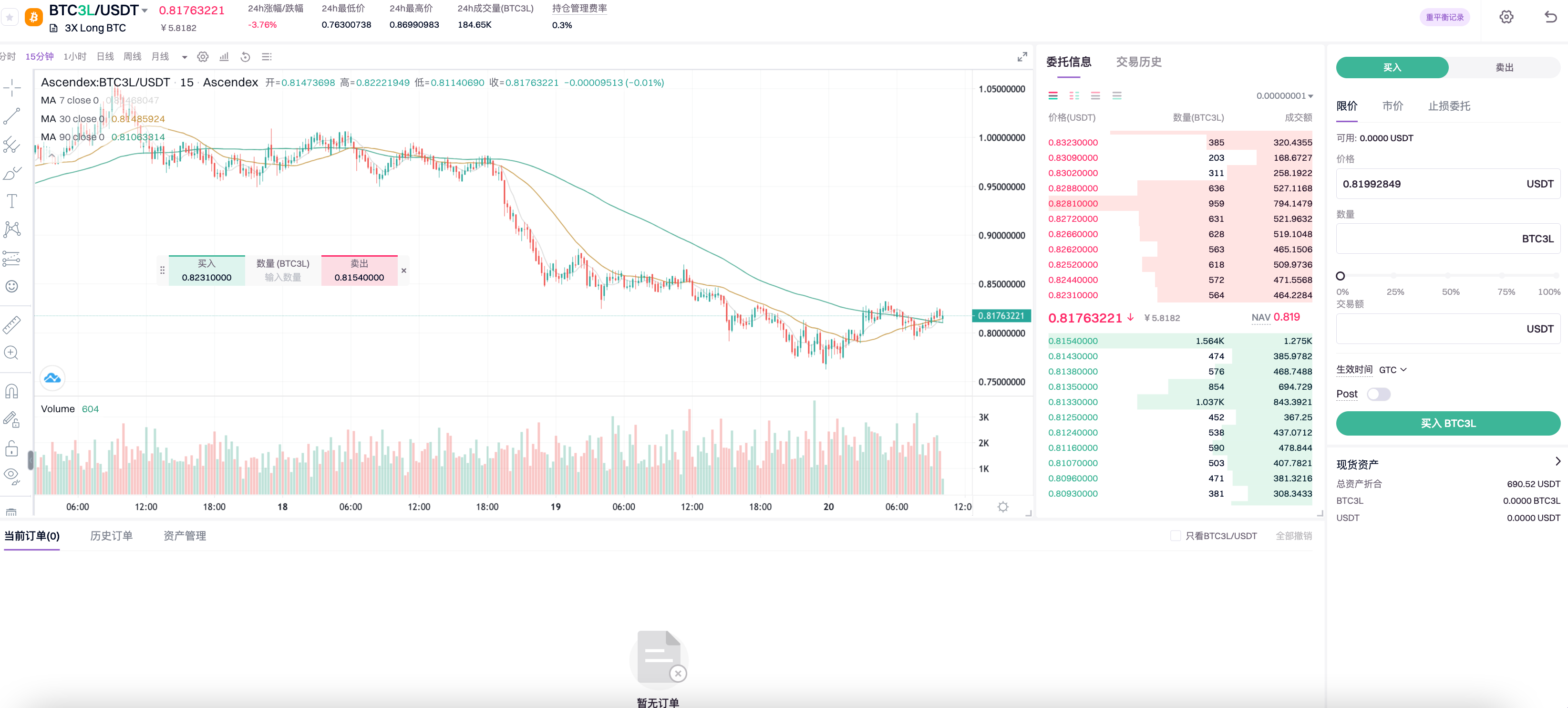 杠杆代币交易类似于币币交易,用户可直接现货市场买卖杠杆代币。