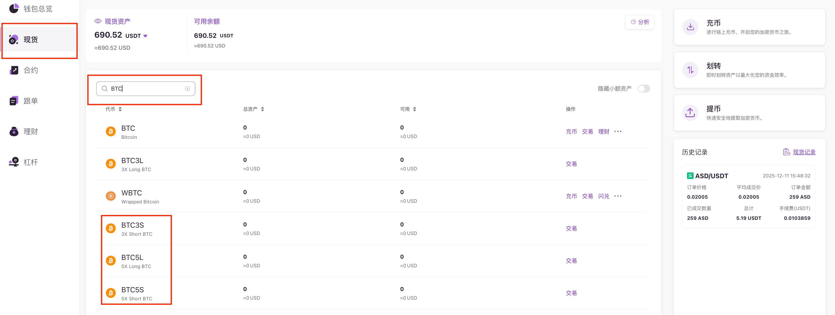 5.杠杆代币交易产品以USDT计价,交易机制类似现货币币交易。用户可直接用USDT交易杠杆代币产品,对应交易资产将显示在用户的现货钱包。
