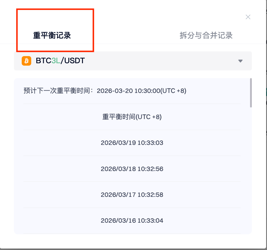 7.为保证杠杆代币当日收益率和对应标的资产现货收益率保持固定倍数(3、5倍),平台将固定于每日10:30:00(UTC+8)进行仓位再平衡。与此同时,若行情出现剧烈波动,标的资产相较于上一个再平衡点的价格波动幅度超过给定阈值时,平台将进行临时再平衡,以控制风险。临时再平衡仅针对受行情波动影响出现亏损的产品,其他未受影响的产品不做调整。顶峰AscendEX将每日公布仓位再平衡记录,用户可于再平衡记录页面查询。