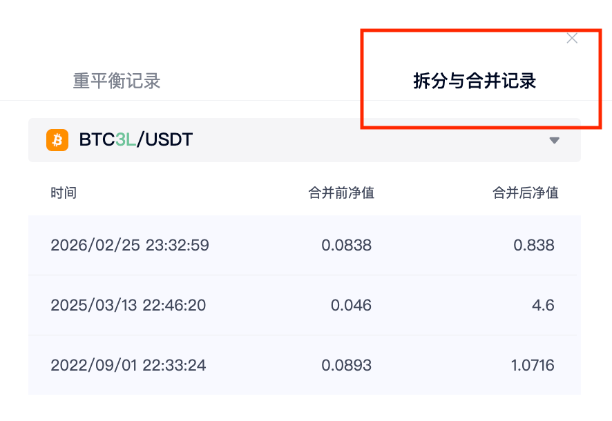 10.平台所有杠杆代币产品初始净值均为1。为优化用户交易体验,若仓位再平衡后杠杆代币净值低于一定阈值,平台将会对当前杠杆代币产品进行合并操作;同理,若仓位再平衡后杠杆代币净值高于一定阈值,平台将会对当前杠杆代币产品进行拆分操作。顶峰AscendEX将及时公布净值拆分合并记录,用户可于拆分/合并记录页面查询。